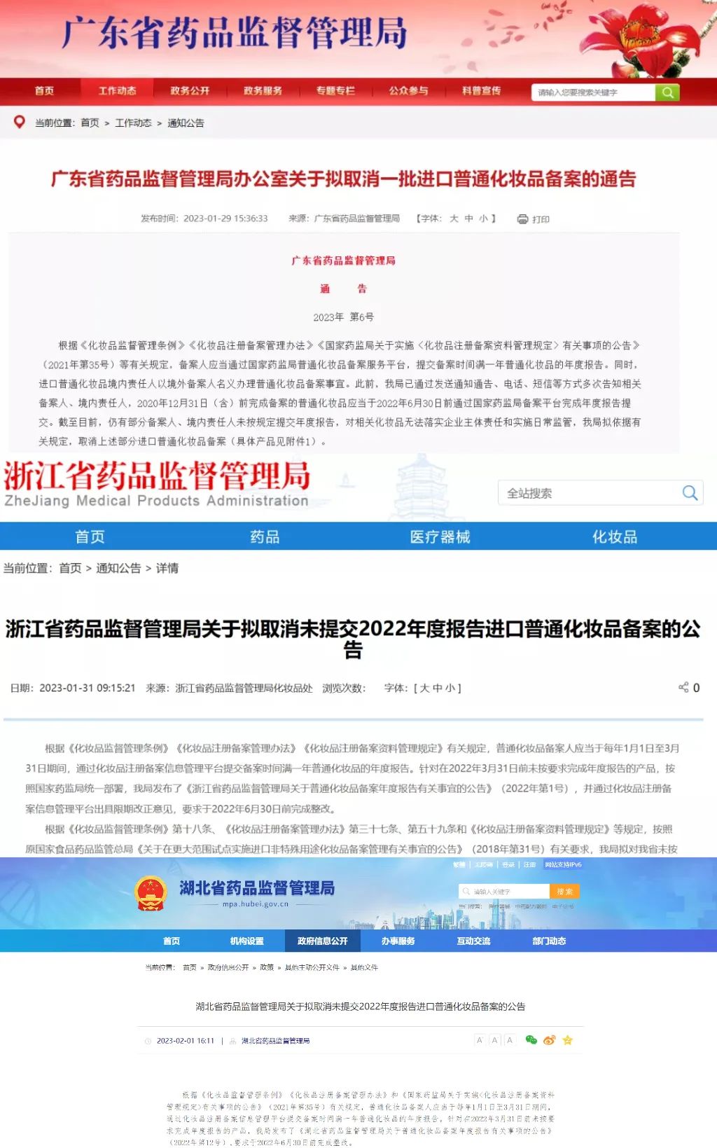1月中旬廣東省藥監局公布擬取消571批次進口普通化妝品備案的名單后,浙江省藥監局在1月底也公布了一批擬取備案的進口普通化妝品名單,包含488批次產品。2月初,湖北省藥監局也公布擬取消14批次進口普通化妝品的名單。